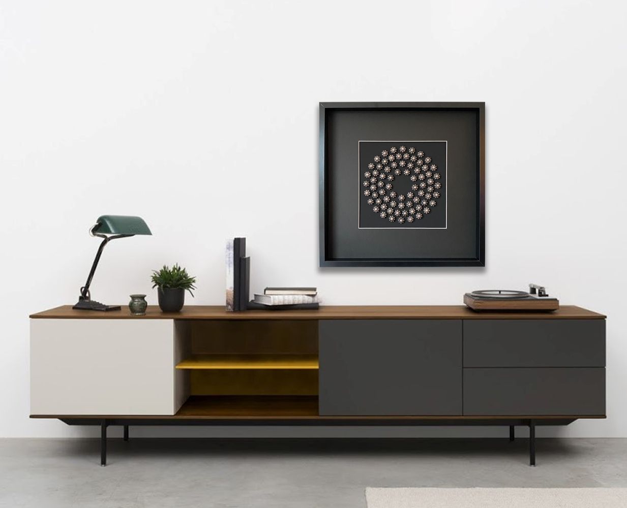 Ingelijst in een strakke zwarte lijst met een dunne witte contour, past dit werk perfect in minimalistische, moderne of high-end interieurs. Het vormt een echte blikvanger boven een dressoir, bank of in een stijlvolle hal.