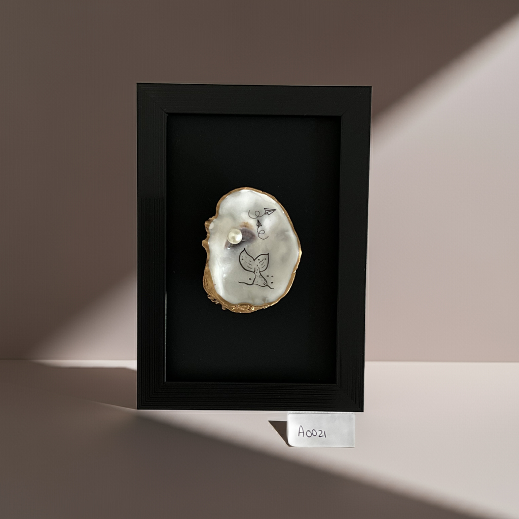 Geef je interieur een vleugje verfijning met onze kleine zwarte lijst met een prachtig beschilderde oesterschelp in het midden.