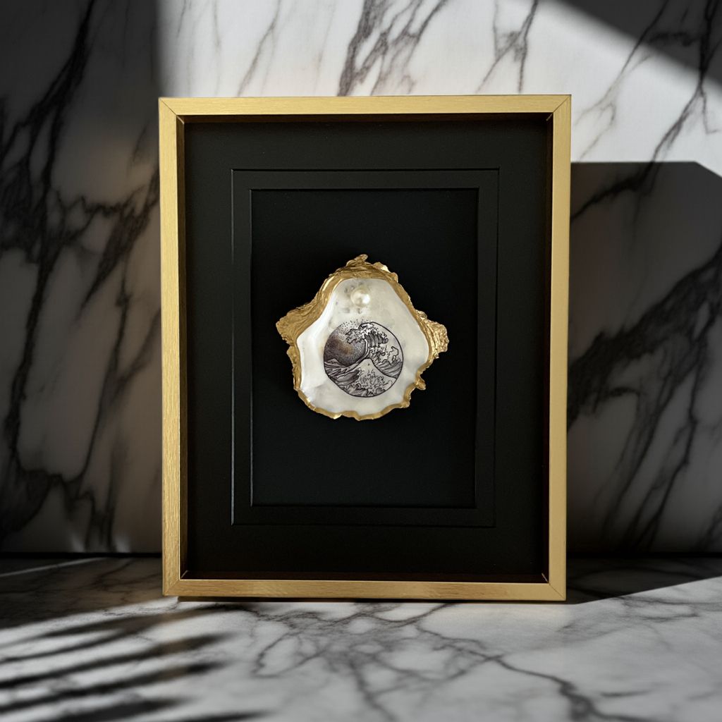 Geef je interieur een vleugje verfijning met onze gouden lijst met een prachtig beschilderde oesterschelp in het midden.