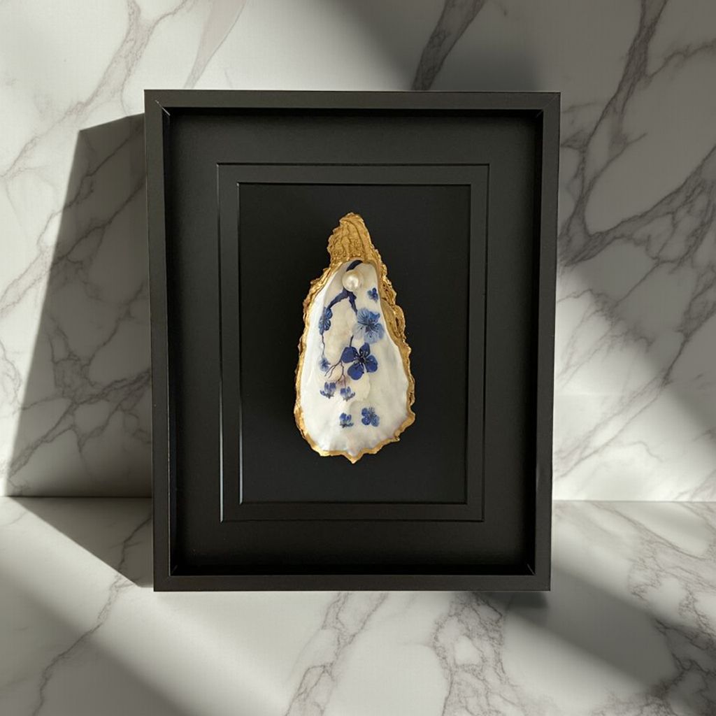 Geef je interieur een vleugje verfijning met onze gouden lijst met een prachtig beschilderde oesterschelp in het midden.