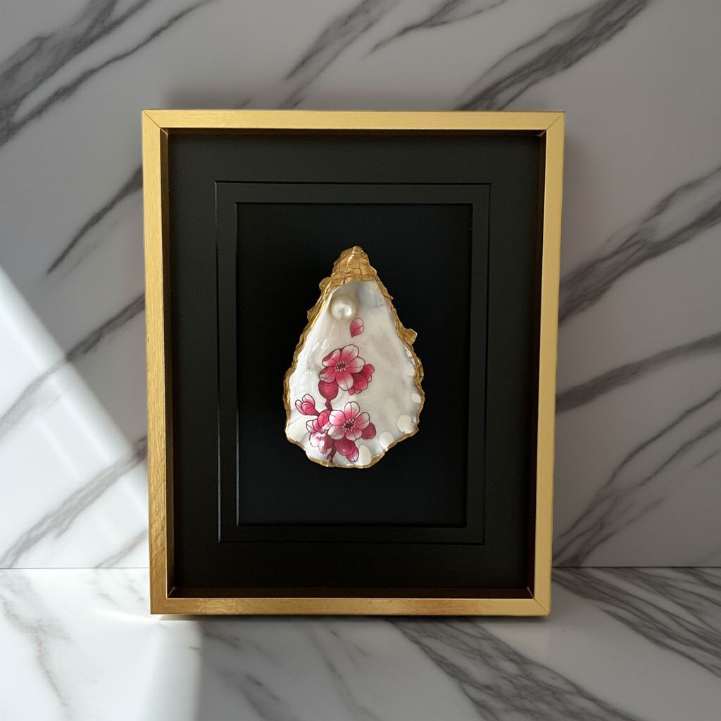 Geef je interieur een vleugje verfijning met onze kleine zwarte lijst met een prachtig beschilderde oesterschelp in het midden.